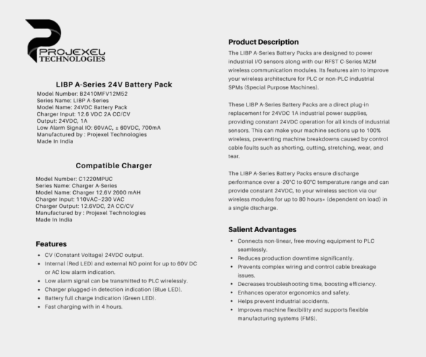 These LIBP A-Series Battery Packs are a direct plug-in replacement for 24VDC 1A industrial power supplies, providing constant 24VDC operation for all kinds of industrial sensors. This can make your machine sections up to 100% wireless, preventing machine breakdowns caused by control cable faults such as shorting, cutting, stretching, wear, and tear.